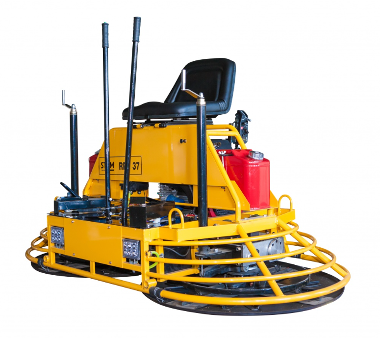 Машина для затирки бетона STEM Techno RPT37, оснащенная электростартером и бензиновым двигателем Honda GX 690 мощностью 24 лошадиные силы, предназначена для выравнивания больших бетонных площадей. Диаметр рабочей зоны составляет 1910 мм. Для обеспечения безопасности предусмотрена педаль аварийной остановки двигателя. Все функции управления машиной вынесены на рукоятки. Регулировка угла наклона лопастей с помощью винта позволяет осуществлять как черновую, так и чистовую обработку бетона. Вес оборудования — 386 кг.
